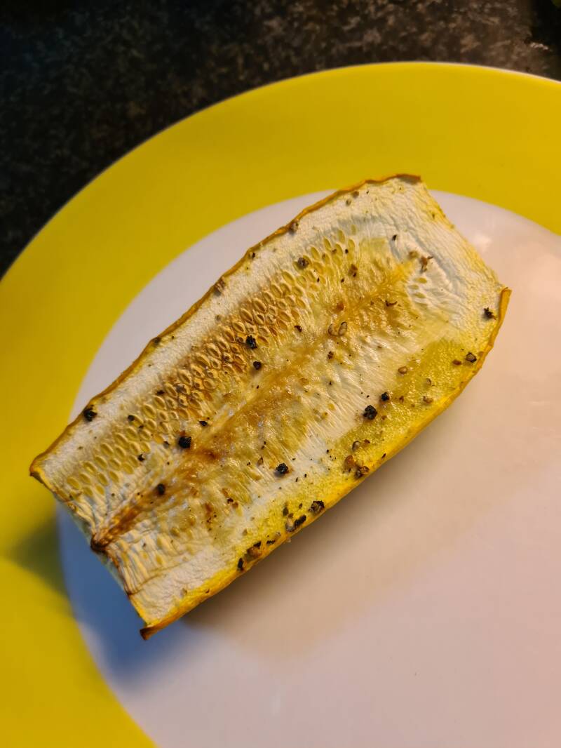We snijden de Courgette in twee stukken. Dan weer in twee helften. Legen die in een ovenschaal. Doen er een beetje Olijfolie er overheen. En peper en zout. Legen dit in de oven. On ongeveer 150 graden. Tot het gaar is.