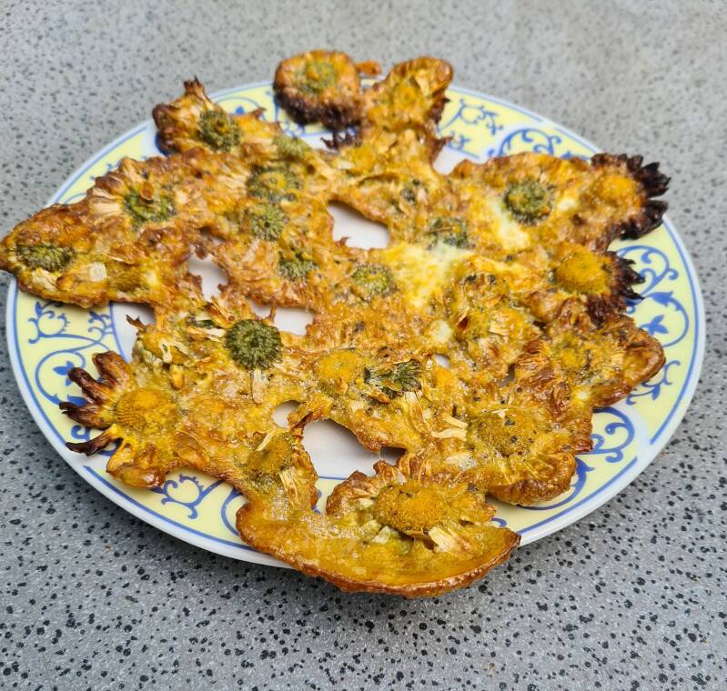We maken van de Eitjes Paneermeel Ketjap Ginger poeder Peper&Zout een beslagje. Doen de margriet bloemen er in. Dan legen we die op een bakplaat met bakpapier. Een beetje Olijfolie er overheen. En legen dit in de oven. Op ongeveer 170 graden. 15 minuten. Laten het afkoelen.