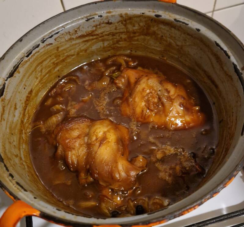 En als de boter is gesmolten, Legen we de Konijn er in. En we smoren even het Konijn aan beide kanten. Een beetje sojasaus er over.